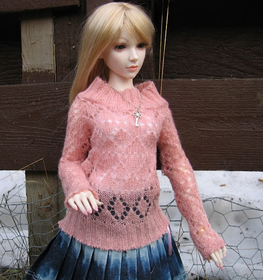 Pusero on ommeltu kirpparilta löytyneestä neuleesta, sukat surautin joskus trikoosta. Avainkoru on yksinkertaisesti valmis riipus ja pätkä jostain purettua kaulaketjua. Hame lienee Dollmoren, ostin käytettynä ja vaihdoin nahkanyörin tilalle satiininauhan. Kengät ovat Mimiwoolta.